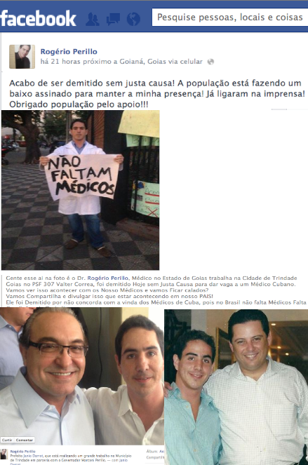 O Dr. Rogério Augusto Perillo postou uma foto segurando um cartaz dizendo que “não faltam médicos” e denunciando ter sido demitido pelo prefeito da cidade de Trindade, próxima a Goiânia, “para dar lugar a um médico cubano”.